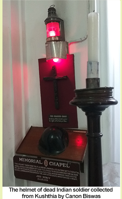 The cross that Canon Subir Biswas carried in Kolkata is the one displayed at St Paul’s Cathedral. The cross still has a latch on one of the beams — evidence that it was once part of a house — and is placed on a simple podium within the chapel. Next to it, on a wall-mounted self is the helmet of an Indian soldier who died in a tank battle, collected from Kushtia district by Canon Biswas on December 13, 1971 — an honour for the Indian army that fought with Bangladesh. Every year on a particular day in December, the Indian army officials come to this corner of the church to pay homage to all soldiers who died in the Bangladesh war.