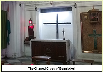 Hardly anyone takes notice of a black cross made of two charred log beams placed on the wall with a very dignified display, and the small bust of a man named Canon Subir Biswas near it.
