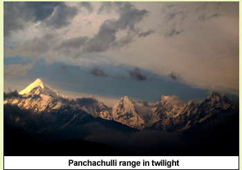 At twilight, all five peaks in full bloom appeared over the horizon on which the setting sun was slowing descending. Out of all five the highest peak of Panchachulli is P2, around 6904 mts high, shone the most.