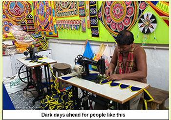 Ajay a qualified law graduate opted for this profession 12 years ago as the situation was brighter. Even a sale of RS 30000 a day was not abnormal in those days specially during winter and Rathyatra time. Now apart from the missing tourist another challenge is Delhi made Pipili appliqué flooded in many places of India.