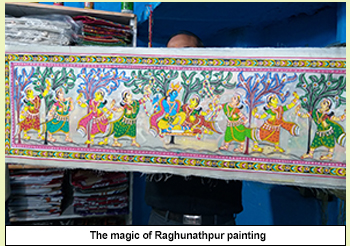 T The mind blowing crafts of Raghurajpur a village 26 km from Pipili are not made on cloths. It is painted on tasar silk and talpatra that is palm leaf. This is mainly a style of miniature painting made on natural color though nowadays artists are using chemical colors. In this art human figure comes dominant followed by floral design and figures mainly taken from characters of Krishnaleela, Hanuman and Ramayana. The eternal love story of Radha and Krishna is an omnipresent subject of talapatra and silk. Like appliqué art work here also blast of colour and a special styled figures are distinctive all the way.