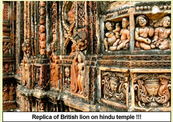 These are motifs of tantra cult. If these blending are amazing, then there are more delightful elements hidden in its terracotta panels. One is the influence of European social life on a temple of Bengal. European influence played so strong on the sculptors that even the lions are all British lions including one on which Devi Durga rides. Similarly all pillars are doric or ionic showing Greek influence.